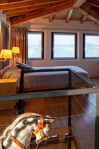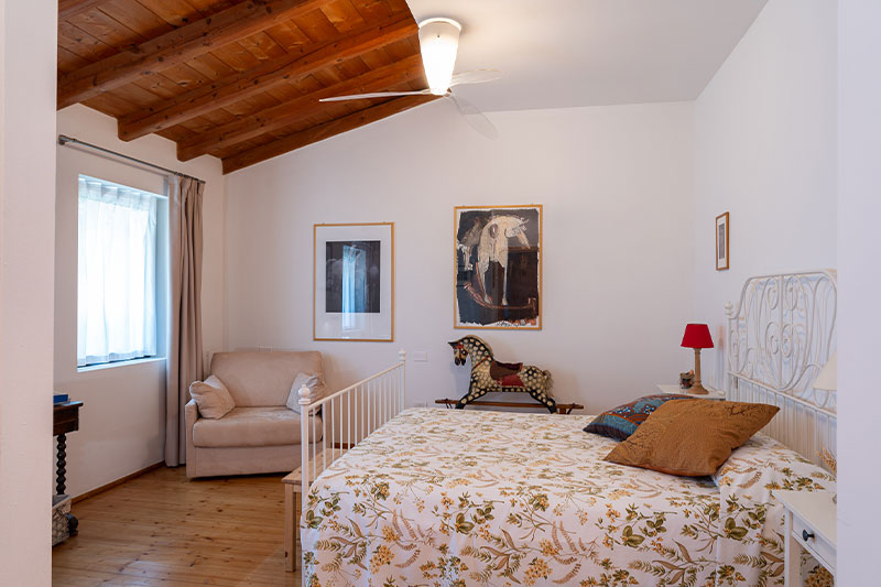 L’ambiente è molto spazioso e bene si presta ad ospitare un terzo posto letto oltre a quello matrimoniale. La camera dispone inoltre di una grande zona bagno dotata sia di doccia che di vasca da bagno. Anche per questa stanza è disponibile, sul grande terrazzo al piano, l’utilizzo di un salottino panoramico. In questa stanza non sono ammessi animali.