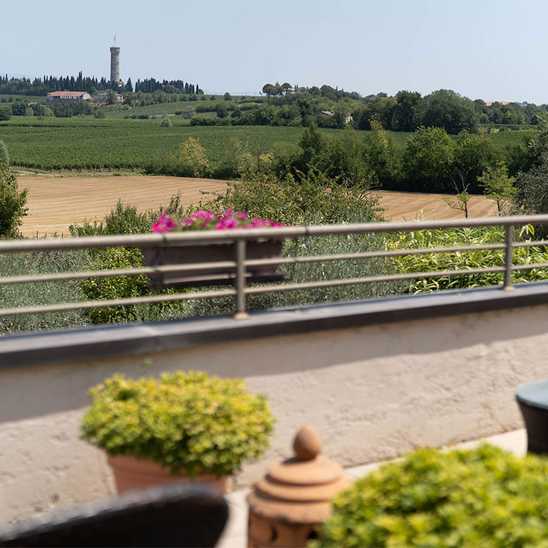 Un soffio di brezza lacustre accarezza le chiome degli alberi. Porta con sé profumo di alloro, lavanda, rosmarino. Il salice, il bamboo e le foglie tutte, risuonano nel silenzio delle campagne come la più bella delle sinfonie mai scritte. Sulla sommità della piccola collina morenica, immersa tra le vigne, una bella casa, baciata dal sole.